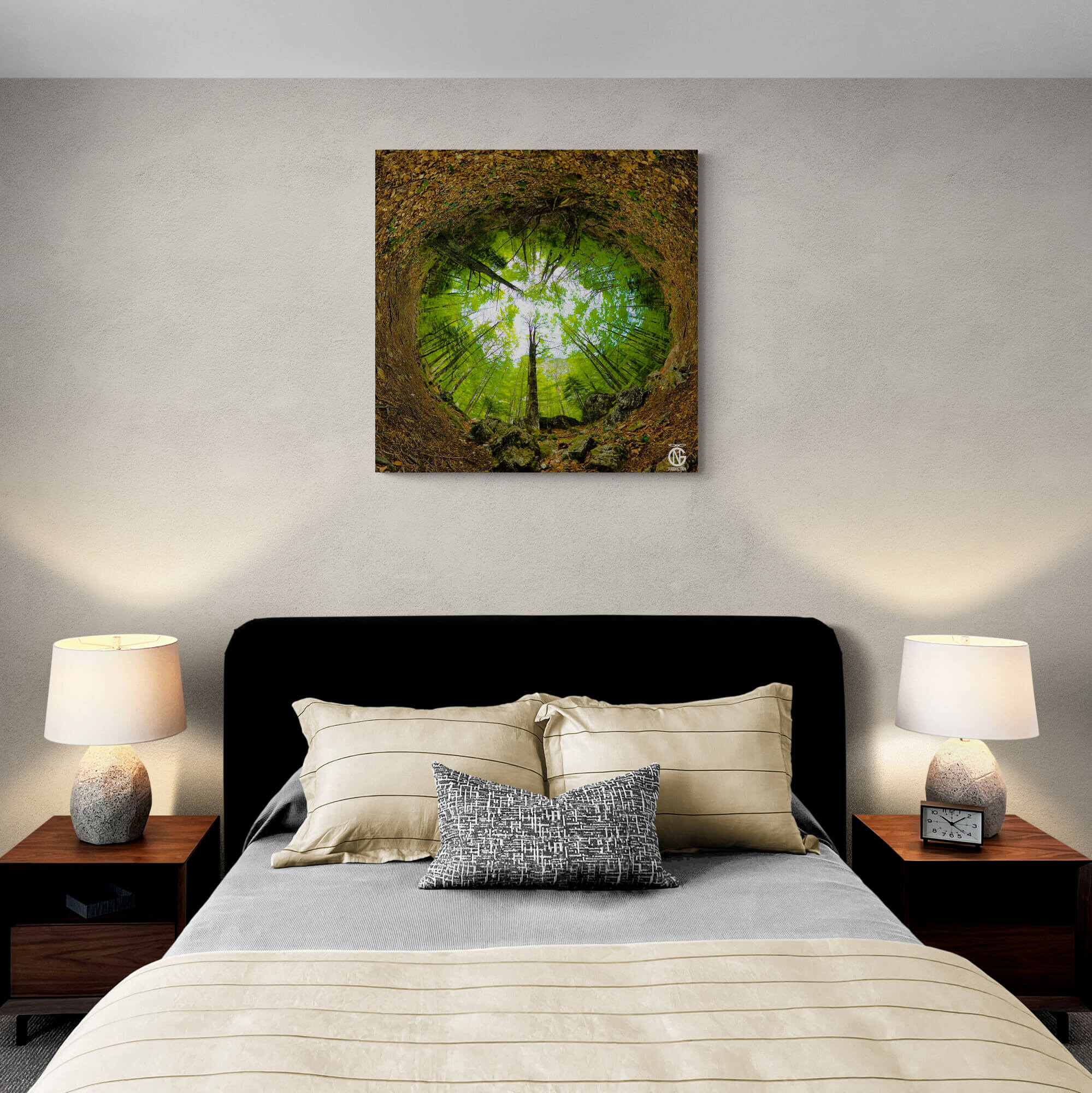 Look upward from the forest floor of Mount Olympus (Prionia): trunks reach for the sky while the green backdrop of leaves wraps into a ring. The soil, dry leaves, and branches blend with the rocks, turning this scene into a work of art born of nature. An inverted tiny-planet 360° canvas brings a fresh, restorative forest atmosphere to your space.