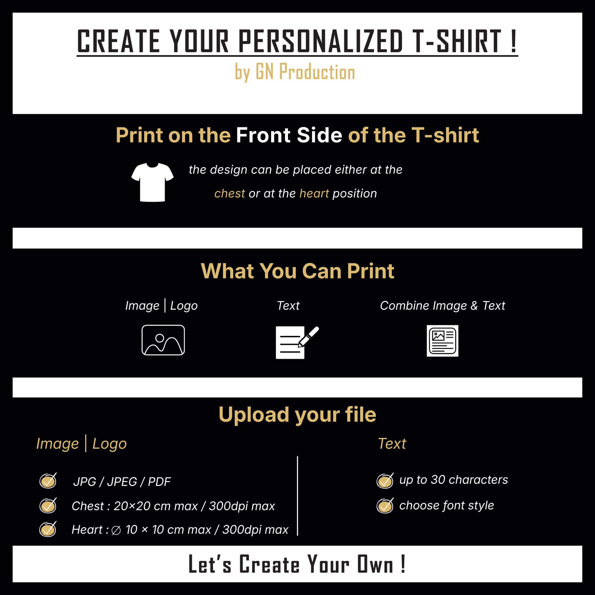 Unleash your creativity with our Create Your Own Premium T-shirt – Front Side, crafted with advanced digital printing technology. Personalize your shirt with your favorite photo, artwork, text, or logo printed on the front side. Whether you want a bold image, a meaningful quote, or a professional logo, this t-shirt delivers sharp, high-resolution prints on soft, premium-quality fabric. Durable, washable, and stylish, it’s perfect for everyday wear, gifts, events, or branding. Experience the perfect blend of comfort, personalization, and premium style.